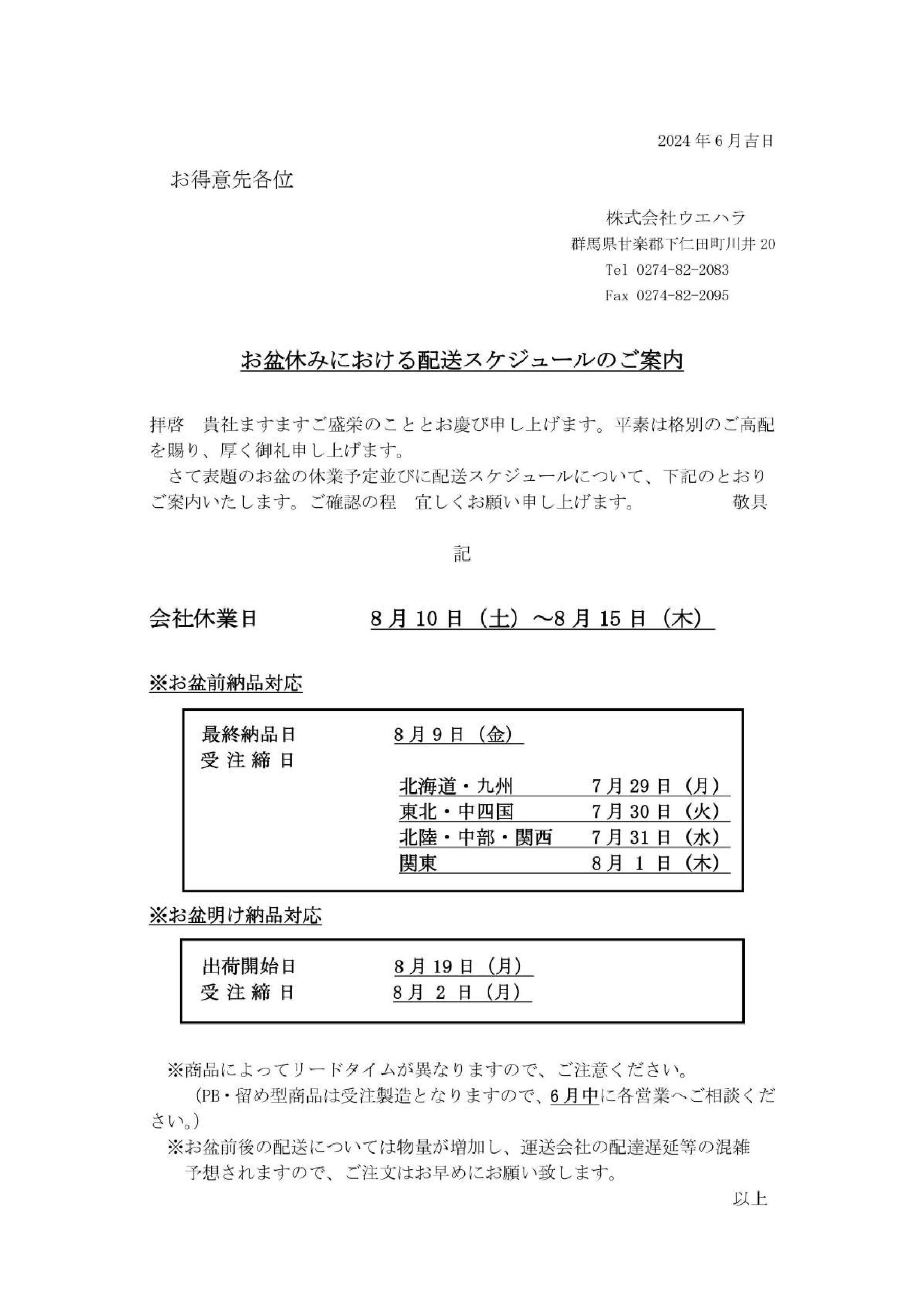トピックス 2024年6月24日 【お知らせ】2024年お盆休みにおける配送スケジュールのご案内です。 お盆休みにおける配送スケジュールのご案内です。 ※上記表をクリックと拡大表示されます。 前の記事 2024年ゴールデンウィーク連休における配送スケジュールのご案内 次の記事 【お知らせ】2024年 年末年始休業のお知らせ